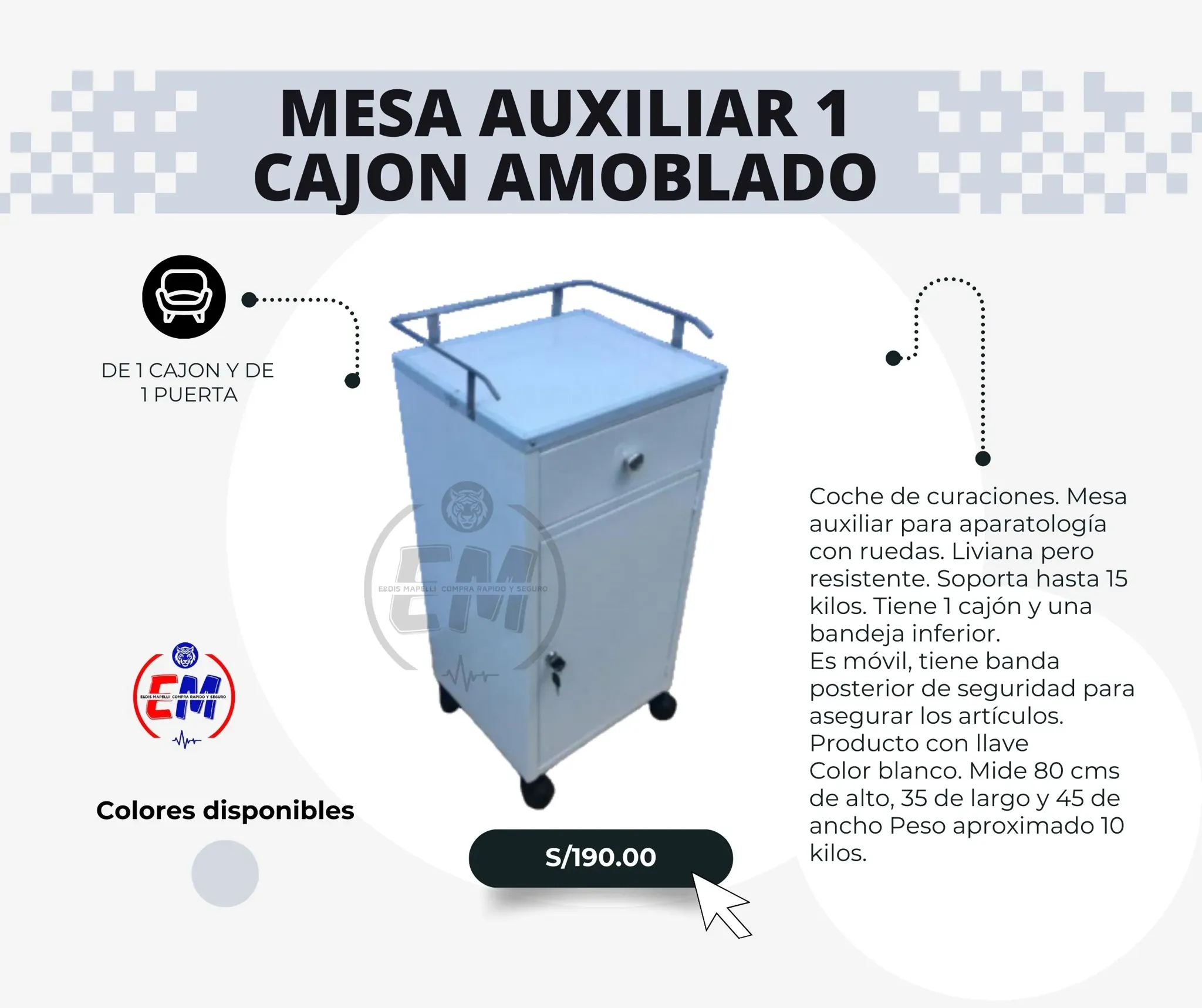 Coche de curaciones. Mesa auxiliar para aparatología con ruedas. Liviana pero resistente. Soporta hasta 15 kilos. Tiene 1 cajón y una bandeja inferior.