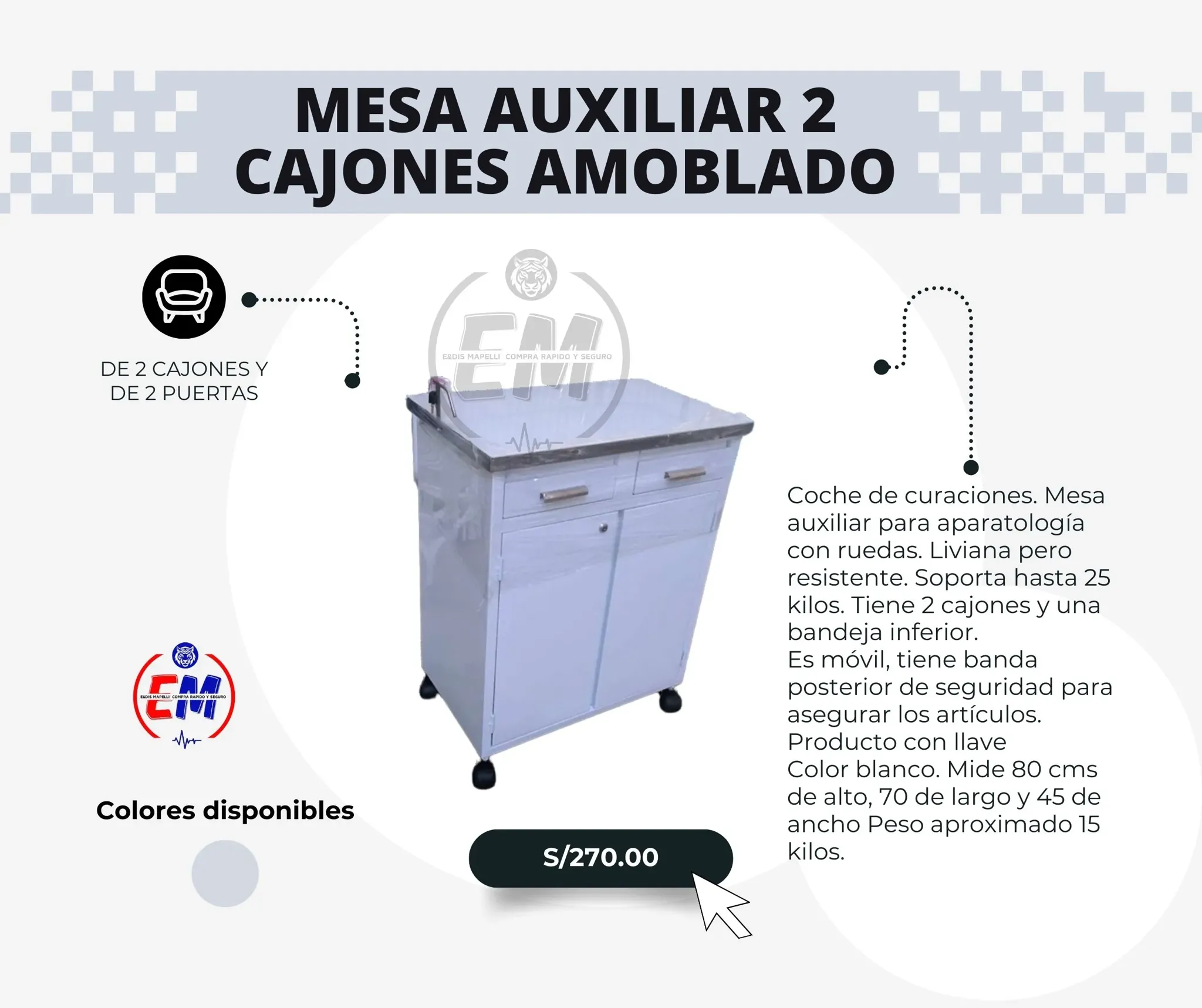 Coche de curaciones. Mesa auxiliar para aparatología con ruedas. Liviana pero resistente. Soporta hasta 25 kilos. Tiene 2 cajones y una bandeja inferior.